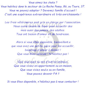 Nous avons, plus que jamais, besoin de familles d'accueil ! Pour des chatons à socialiser, ou des gentils, pour des juniors, des adultes, des séniors, qu'ils soient sans problème de santé ou avec, nous estimons que tous ont besoin d'amour et méritent d'être aimé, sans distinction d'âge, de maladies, de pathologies. Si vous avez une petite place chez vous, beaucoup dans votre coeur, que vous ne pouvez vous engager pour une adoption, être famille d'accueil peut être la solution pour les aider et les aimer ! Alors, si vous habitez le 86, plutot secteur Châtellerault / Chauvigny / La Roche Posay, ou encore Tours et sa périphérie, n'hésitez pas à nous contacter ! Par avance, merci pour eux.