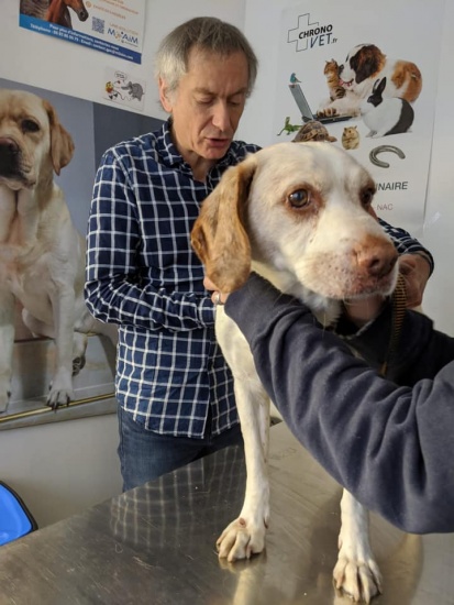 César a quitté le refuge pour aller à la clinique vétérinaire du Pont de Neuilly et subir une batterie d'examens pour trouver la cause de la grosseur au bas-ventre. Il est examiné par Thierry Bedossa. Ph. DRIl y a 4 ans, ses maîtres sont morts, l’un après l’autre en l’espace de quelques semaines, le laissant orphelin. La ferme revenant au fils, César aurait dû rejoindre ce dernier si le destin n’avait pas rappelé Jacques auprès de ses parents… Le sort est rude avec César qui, en l'espace de quelques mois, s'est retrouvé sans famille.