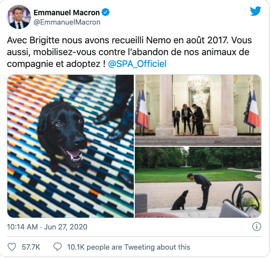 Même le président de la République a tweeté sur l’abandon le 27 juin dernier ! C’est dire si la mobilisation, ce jour-là, a été forte sur les réseaux sociaux puisque l’appel a été entendu jusqu’au sommet de l’Etat. Pour l’occasion, Emmanuel Macron a posté une photo de son fidèle Némo, adopté à la SPA au tout début de son mandat : « Avec Brigitte, nous avons recueilli Némo en août 2017. Vous aussi, mobilisez-vous contre l’abandon des animaux de compagnie et adoptez ! ». C’est par cette injonction que le chef de l’Etat a tenu à mettre en lumière l’abandon qui frappe chaque année des milliers de chiens et de chats de notre pays, mais aussi de tous les pays d’Europe et des autres continents où l’animal de compagnie est considéré comme un objet.