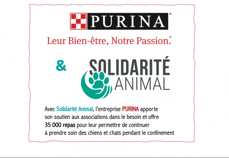 L’année 2020 a été rude pour nombre d’associations de protection animale. Afin d’apporter son soutien, l'entreprise Purina s’associe à Solidarité-Animal pour offrir près de 35 000 repas pour chats et pour chiens. Concrètement, l’offre prend la forme de 300 bons d’achat de 50 euros chacun, soit un total de 15 000 euros.
