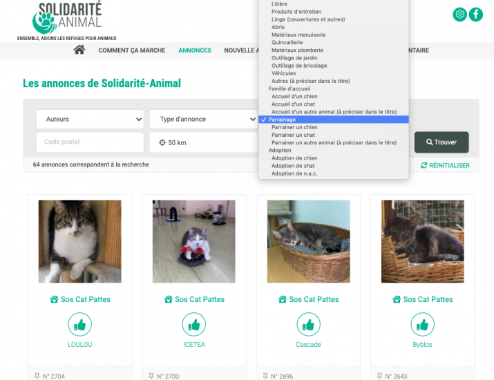 Retrouvez toutes les offres de parrainage sur le site de Solidarité-Animal sur la page « Annonces », rubrique « Parrainage »