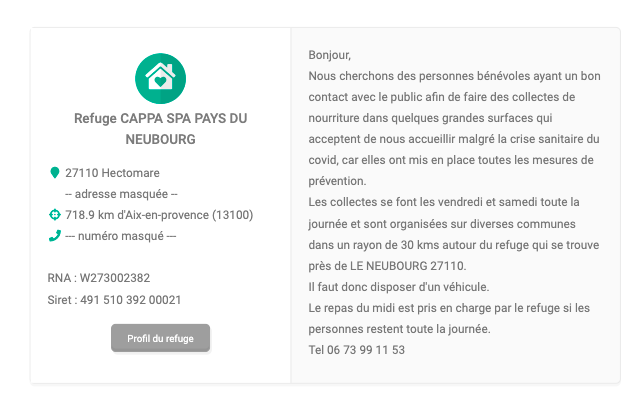 Par ailleurs, il est possible d'aider le refuge avec des dons de nourriture, plus que jamais d’actualité, ainsi que les soutiens financiers pour permettre à l’association d’acheter l’alimentation manquante et continuer à assurer les autres frais essentiels, comme les dépenses vétérinaires.