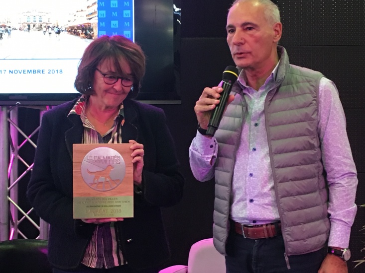 C’est Bernardo Gallitelli, PDG de Buena Media Plus (qui édite le magazine 30 Millions d’amis), qui a remis en mains propres le trophée à Valérie Barthas-Orsal, adjointe au maire et déléguée à l’animal qui avait fait le déplacement. Elle a pris la parole pour expliquer en quoi la ville méditerranéenne met tout en œuvre pour permettre aux chiens, mais aussi aux chats, de partager l’espace public.