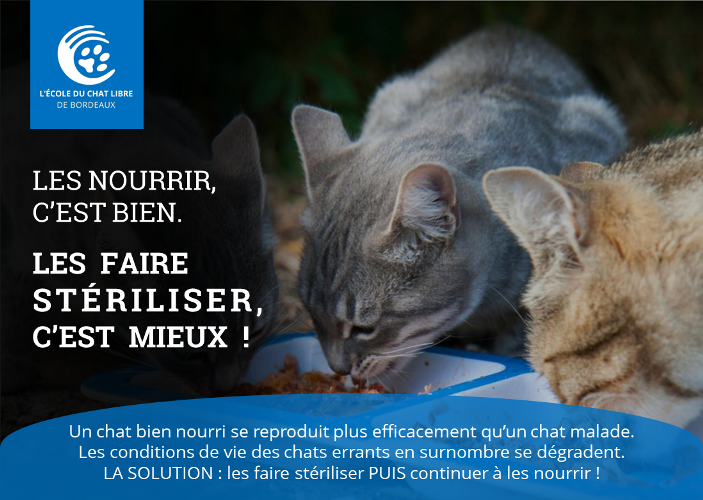 L’École du chat libre de Bordeaux (33) a trois missions principales : la stérilisation des chats errants, l’adoption des chats les plus sociaux et la sensibilisation du grand public aux problématiques des chats des rues. C’est justement pour alerter sur la situation de ces félins que l’association a fait appel à Solidarité-Peuple-Animal. Elle souhaite faire passer un message essentiel auprès de toutes les personnes désireuses d’œuvrer pour la protection des matous : la stérilisation des chats errants, même en période de reproduction, est la seule solution efficace pour lutter contre la surpopulation et la misère féline.