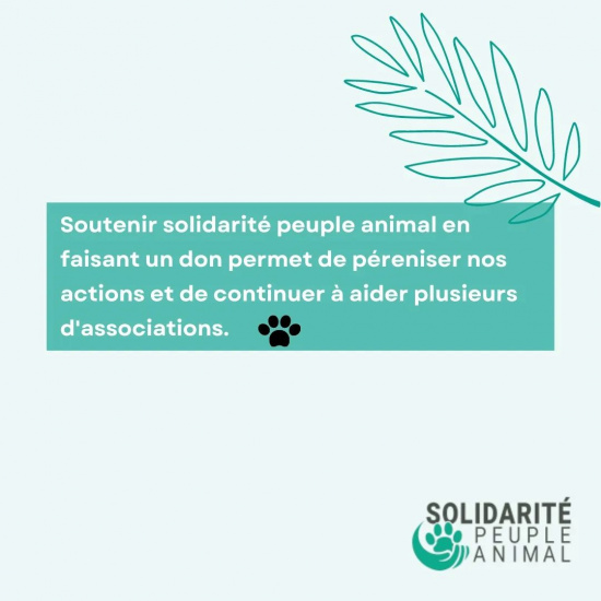 Enfin, sachez que Solidarité-Peuple-Animal est une association, reconnue comme œuvre ou organisme d'intérêt général. Il est possible de nous soutenir dans nos actions en faisant un don ouvrant droit à une réduction d'impôts. L’association a besoin d’aide pour continuer de financer la Journée mondiale contre l’abandon, ainsi que des projets pour les refuges et les associations. Depuis trois ans, de nombreuses opérations solidaires ont ainsi été organisées à destination des associations de protection animale, qu’il s’agisse de collectes, de distributions sur tout le territoire de nourriture, litière et accessoires ou bien encore d’équipement en matériel informatique.