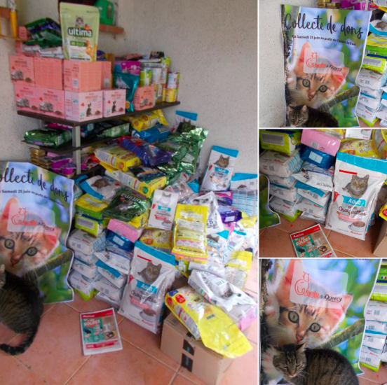 L'association Chats du Quercy (Tarn-et-Garonne) a collecté l'équivalent de 6 caddies de nourriture © Chats du QuercyCertaines collectes ont eu des résultats plus modestes, ce qui n’a pas rendu l’opération moins utile. Ainsi, l’association Chat'ouille - Cat's rescue située dans les Vosges (88), a passé la journée du 25 juin dans un hypermarché du département voisin, en Meurthe-et-Moselle (54). « Nous sommes repartis avec 4 caddies remplis, détaille la présidente, Nathalie Osborne. Cela devrait nous permettre de tenir environ un mois, et de donner à nos chats de la nourriture humide car nous avons eu des dons de sachets. »