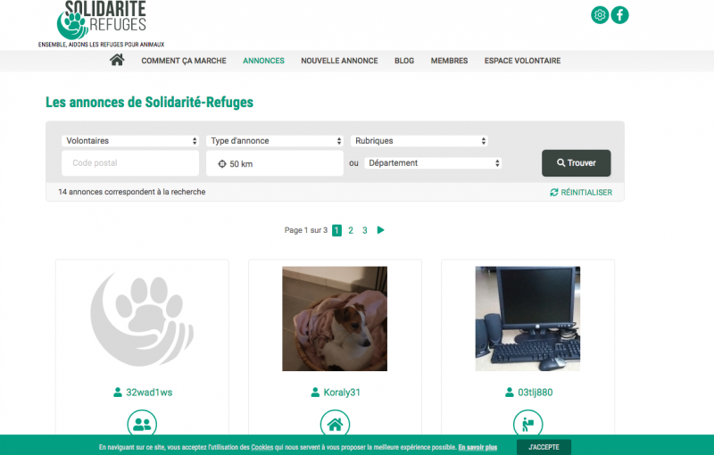Vous pouvez aussi consulter les annonces que les membres volontaires ont postées. Pour cela, il vous suffit de cliquer sur « annonces » dans la barre de menu. Puis de sélectionner une catégorie d’auteurs de l’annonce (ici « volontaires ») et, au besoin, d’indiquer un département et un rayon de recherche via le curseur des kilomètres. Vous avez alors accès à toutes les « offres » et propositions d’aide postées par les volontaires comme l’aide au nettoyage, l’accueil d’un animal, le don de matériel ou autre… Comme dans le cas de figure précédent, il vous reste à contacter le membre volontaire via la messagerie privée de Solidarité-refuges ou par le téléphone si un numéro est indiqué.