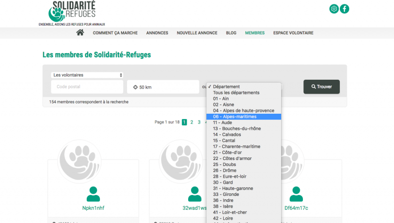 Pour cela, cliquer, dans la barre de menu, sur « membres ». Dans l’onglet à gauche (vous recherchez), sélectionnez « volontaires », puis indiquez dans l’onglet à droite le département dans lequel vous vous situez avant d’appuyer sur « trouver » (la loupe). Le moteur de recherche sortira toutes les fiches des membres situés dans le département que vous avez indiqué. Vous pouvez aussi utiliser le curseur des kilomètres afin de préciser un rayon de recherche autour de votre lieu (de 0 à 400 km).