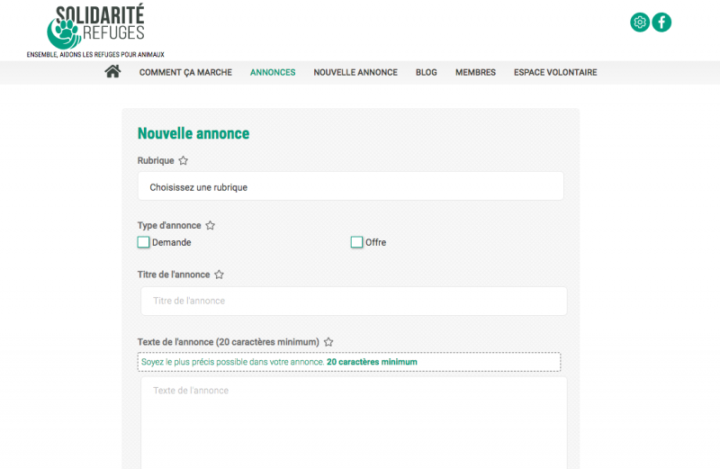 Pour cela, si votre structure est déjà membre de Solidarité-refuges, il suffit d’aller sur l’onglet « nouvelle annonce » et de préciser vos besoins.