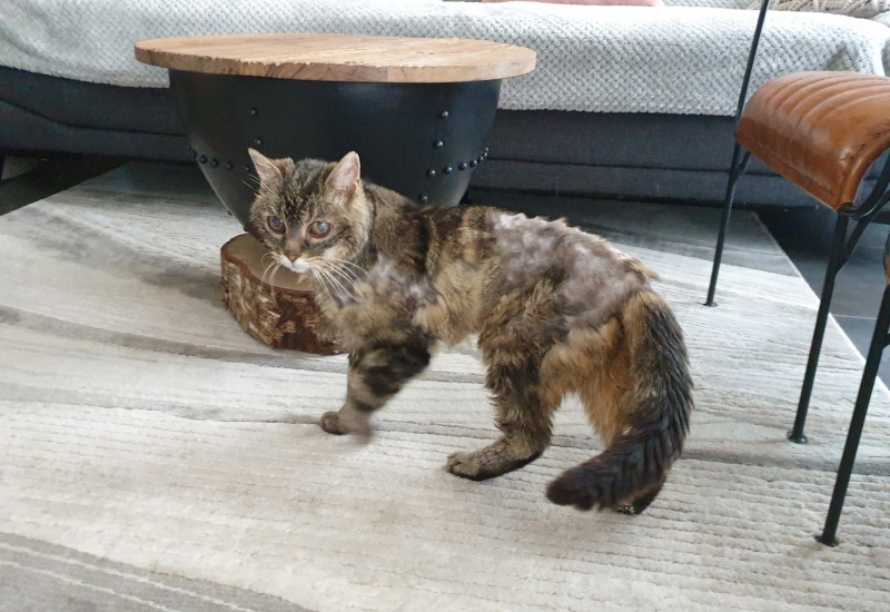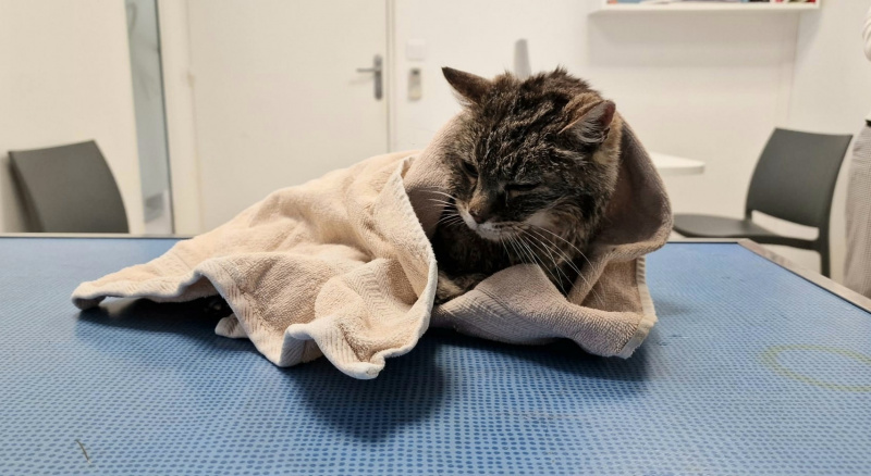 Grâce au sauvetage de l'association, Géryon a retrouvé une vie paisible ©Mon jour de chanceUne fois entre les mains de Mon jour de chance, association spécialisée dans les sauvetages d’animaux en grande détresse, Géryon a reçu les soins nécessaires pour l’aider à continuer à vivre. Peu à peu réhydraté, entièrement tondu, il a même survécu à l’épreuve du bain. « Nous n’avons pas eu d’autre choix que de le laver, détaille Christophe, co-fondateur de l’association. Nous avions très peur car c’est toujours une opération délicate pour un chat aussi fragile. Il a fait un petit malaise dû au stress mais il a tenu. »