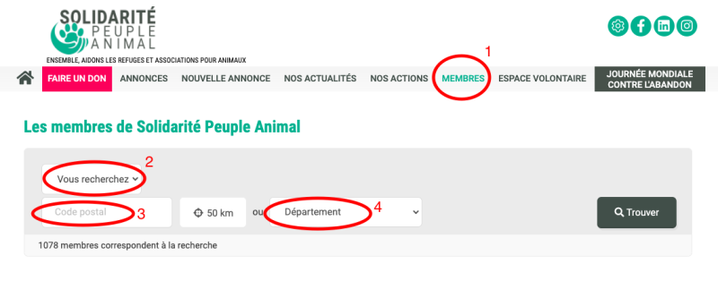 Dans la rubrique « nos membres » (1) vous pouvez avoir un aperçu de l’ensemble des personnes inscrites sur Solidarité-Peuple-Animal. Pour sélectionner les bénévoles, vous pouvez appliquer un premier filtre dans l’onglet « Vous cherchez » (2) en choisissant « Les volontaires ». Vous avez également la possibilité d’appliquer un filtre géographique en entrant votre code postal (3) ou en sélectionnant votre département (4).
