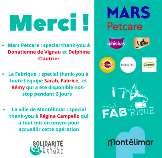 ©DRAu côté de tous les « Marcheurs » au grand cœur, plusieurs acteurs ont rendu cette opération solidaire possible, à commencer par Mars Petcare, fidèle partenaire de Solidarité-Peuple-Animal, qui a converti les kilomètres parcourus en repas. La ville de Montélimar et la brasserie et salle de concert La Fabrique ont aussi participé au succès de cette opération, en permettant à Solidarité-Peuple-Animal de stocker la précieuse marchandise et d’organiser la distribution pendent deux jours, du 22 au 23 novembre.
