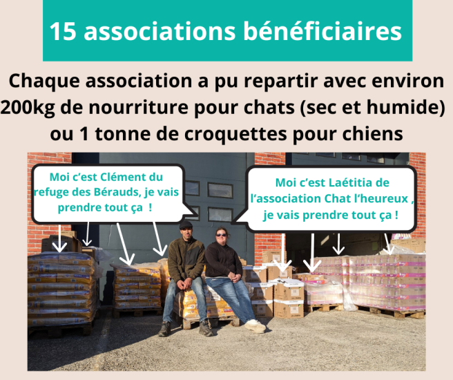 Chaque association a pu repartir avec environ 200kg de nourriture pour chat (sèche et humide) ou une tonne de croquettes pour chien. « Cela va nous permettre d’économiser énormément car la nourriture représente un coût financier très élevé pour un refuge comme le nôtre où nous avons actuellement 150 chiens et 180 chats proposés à l’adoption, détaille Sabrina Degrange du refuge de l'Espoir - SPA de Pierrelatte et du Tricastin. C’est la première année que nous avons autant de prises en charge. Nous sommes donc vraiment ravis de ce don et nous remercions toutes les personnes qui l’ont rendu possible. »