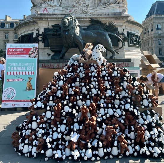 Solidarité-Peuple-Animal a organisé, mercredi 26 juin, une opération inédite, place de la République à Paris. L’objectif : sensibiliser le public sur l’ampleur du fléau des abandons, en matérialisant, par des peluches, le nombre d’animaux abandonnés en France par jour. On estime ce chiffre à 720, soit un animal abandonné toutes les deux minutes. « Une montagne de peluches sur un point aussi central et symbolique de Paris qu'est la Place de la République a permis aux passants et à ceux qui sont venus tout exprès de visualiser en un seul coup d'œil ce que peuvent représenter 720 animaux qui entrent chaque jour dans les fourrières, refuges et associations car ils n'ont pas ou plus de maîtres. Et c'est comme cela tous les jours ! » alerte Katia Renard, présidente de Solidarité-Peuple-Animal à l’origine de cette opération.