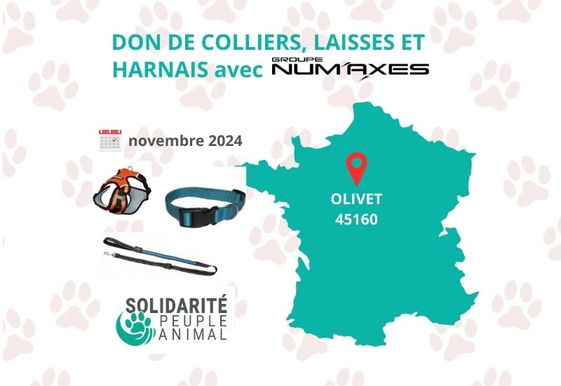 Grâce à notre partenaire Numaxes-Eyenimal, 1505 colliers, harnais, et laisses seront distribués aux refuges et associations en novembre 2024 à Olivet (45160).