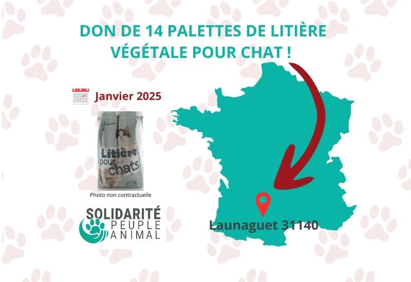 Grâce à notre partenaire Phenix anti-gaspi, un don de litière végétale non agglomérante de type pellets, sera distribué aux refuges et associations en janvier 2025 à Launaguet (31140) près de Toulouse.