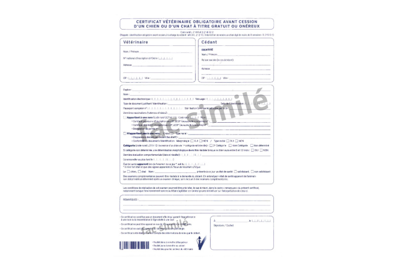 Il n’existe aucun formulaire obligatoire proposé par les services publics, mais le Syndicat National des vétérinaires d’Exercice libéral (SNVEL), le syndicat national des animaleries (Synapses) et le syndicat national des professionnels du chien et du chat (SNPCC) proposent des documents types aux vétérinaires.